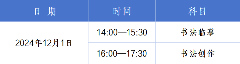 3.開考15分鐘后,考生不得進入考點參加相應科目考試。書法臨摹考試結束前15分鐘內方可交卷,交卷后不允許出場,不得接觸手機等違規物品。書法創作考試結束前30分鐘內方可交卷出場,交卷出場后不得再進場續考,也不準在考場附近逗留或交談。